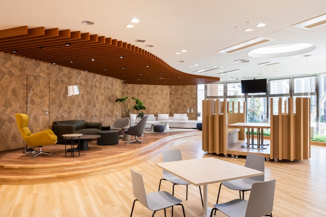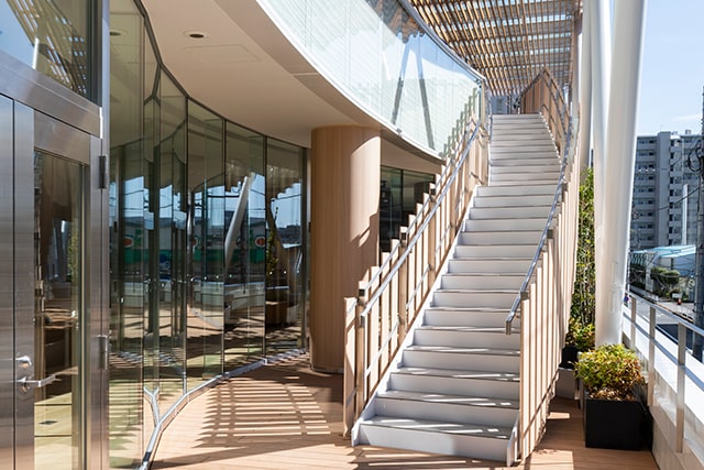施設が立地する木場にちなみ木・緑をふんだんに取り込んだ外観。シンプルな直線を主体としつつ、曲線や奥行きのある形状を取り入れることで通常のオフィスと異なり柔らかい印象を与えるデザインが特徴。