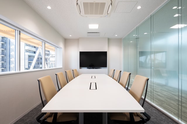 オンライン環境を備え、少人数での会議や来客の対応に利用可能なミーティングルーム。