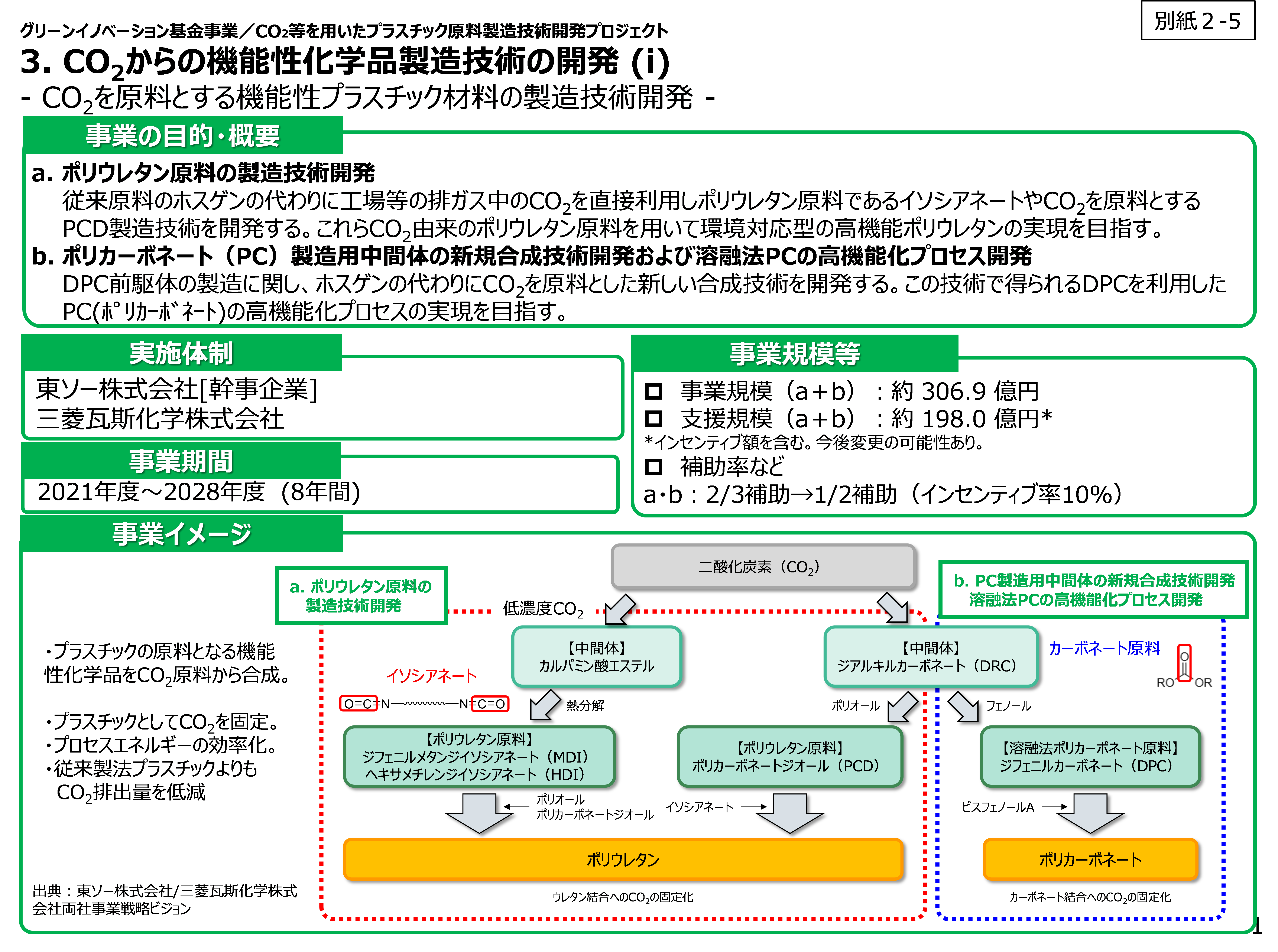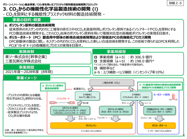 東ソー株式会社(社長:山本 寿宣)を幹事会社として、三菱瓦斯化学株式会社(社長:藤井 政志)との2社は、国立研究開発法人産業技術総合研究所触媒化学融合研究センター、国立大学法人東北大学大学院工学研究科・応用化学専攻冨重圭一教授、化学工学専攻福島康裕教授、公立大学法人大阪 大阪市立大学人工光合成研究センター田村正純准教授、コルコート株式会社等の共同研究先と連携して、国立研究開発法人新エネルギー・産業技術総合開発機構(NEDO)から公募された「グリーンイノベーション基金事業/CO2等を用いたプラスチック原料製造技術開発」の研究開発項目3「CO2からの機能性化学品製造技術の開発」に対し、「CO2を原料とする機能性プラスチック材料の製造技術開発」を提案し、このほど採択されました。