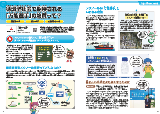 「おしごと年鑑2023」では、「循環型社会で期待される「万能選手」の物質って? 」というテーマのもと、環境循環型メタノール構想を、豊富な図版と親しみやすいイラストで紹介しています。