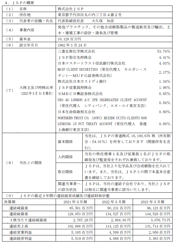 (注)「所有割合」とは、JSPが本日公表した「2024年3月期第2四半期決算短信〔日本基準〕(連結)」において記載されたJSPの2023年9月30日現在の発行済株式総数31,413,473株)から、同日現在のJSPが所有する自己株式数(1,605,444株)を控除した株式数(29,808,029株)に対する割合をいい、小数点以下第三位を四捨五入しております。以下、所有割合の計算において同じといたします。