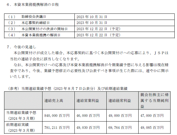 本日現在、当社はJSP普通株式16,100,676株(所有割合:54.01%。間接所有を含む。)を所有し、JSPは当社の連結子会社に該当しておりますが、本公開買付けにおいて、JSPが、応募株式の全てを買い付けた場合、当社の議決権比率(間接所有を含む。)は47.74%となるため、本公開買付け後においてJSPは当社の連結子会社に該当しないこととなり、新たに当社の関連会社に該当することとなる見込みです。そのため、JSPが本公開買付け後において当社の連結子会社に該当しないこととなった場合には、本基本合意書に基づく本資本業務提携は、2023年12月22日(本公開買付けの決済の開始日)付で解消されることとなります。