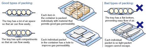 A:AGELESS™ can be used with the nitrogen gas replacement system. However, this combination will result in a slow rate of oxygen absorption due to the low initial oxygen concentration; therefore, select a larger size of AGELESS™ to compensate for the delay in oxygen absorption. In addition, gas replacement will tend to result in an imbalanced replacement rate; therefore, when using AGELESS™ with gas purge, please use a size of AGELESS™ larger than the calculated size. Carbon dioxide gas replacement and mixed carbon dioxide-nitrogen gas replacement are not recommended for use with AGELESS™, as carbon dioxide will inhibit the oxygen absorption of AGELESS™.